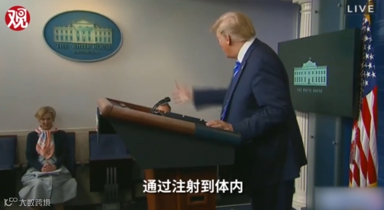 不过很快,更神奇的点子就来了。特朗普说着“……你们说了你们要试试看”,就想到了另外一件好东西——消毒剂。