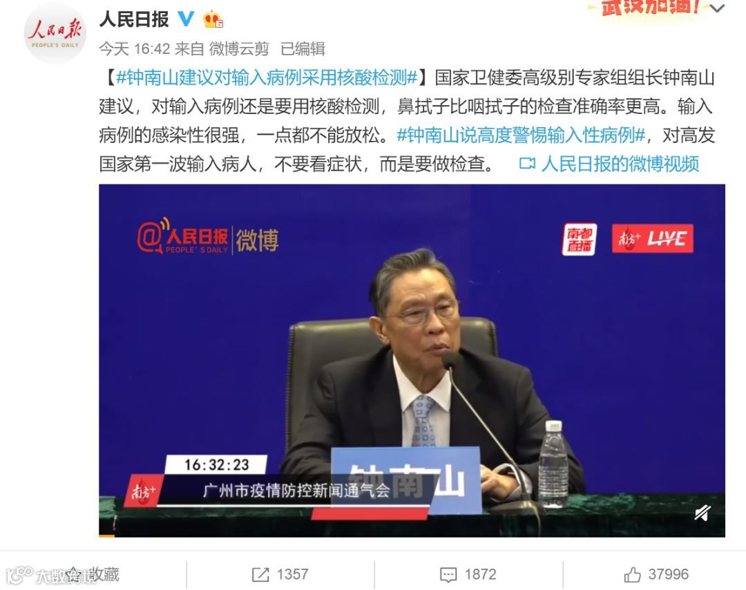 钟南山院士紧急预警:输入病例的感染性很强,一点都不能放松。尤其对疫情高发国家来的第一波输入病人,不能只看体温等表面症状,而是要做核酸检查,避免漏检。