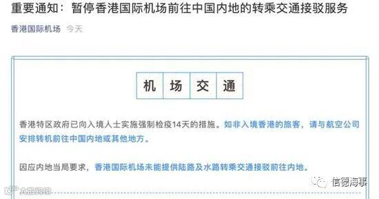 今天,香港特区政府明确:因应内地当局要求,香港国际机场未能提供陆路及水路转乘交通接驳前往内地。