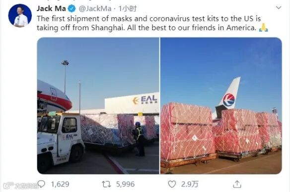 3月16日,马云在海外社交平台发布动态,晒图称首批运送援美口罩和病毒检测试剂的航班已从上海起飞。马云还对美国朋友送出美好祝愿。