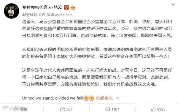上周,马云在个人微博介绍,多方努力筹到的50万份检测试剂盒和100万只口罩,准备捐赠给美国人民。