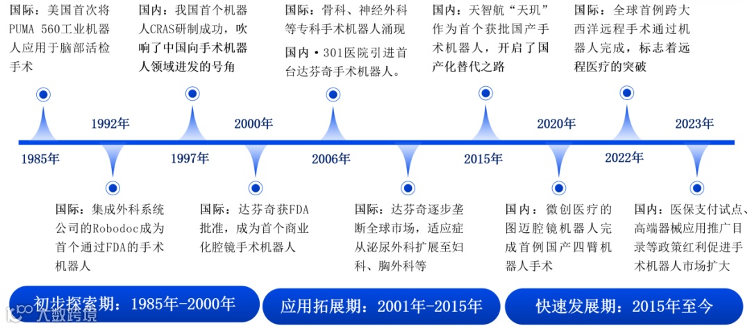 从行业发展生命周期角度看,手术机器人历经了早期探索、应用拓展、快速发展三个主要时期。