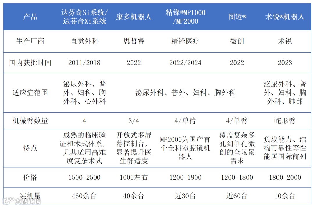 截至目前,国内累计获批超10款,包括达芬奇Si和达芬奇Xi、思哲睿康多、精锋MP1000、微创图迈、术锐®机器人等,装机量近600台。达芬奇凭借成熟的临床验证和完整的术式体系,占据70%市场,国产产品凭借性价比和本土化优势等正加速入局,其中,微创的图迈是国内最早上市的四臂腔镜机器人,产品性能国内外领先,远程系统优势突出,在全球超30个国家或地区获得注册认证,成功进入欧洲市场;精锋医疗MP2000兼具科室广度、术式难度优势;康多机器人以更高性价比优势加快进入县级医院市场。