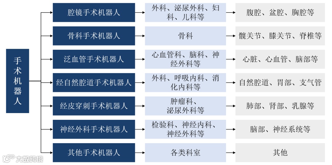 根据临床场景,主要分为腔镜、骨科、泛血管、经自然腔道、经皮穿刺、神经外科手术机器人等。