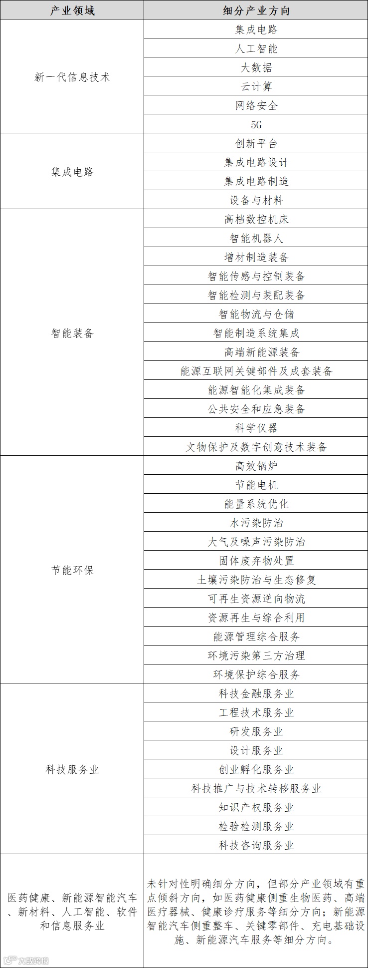 表1 十大高精尖产业细分方向