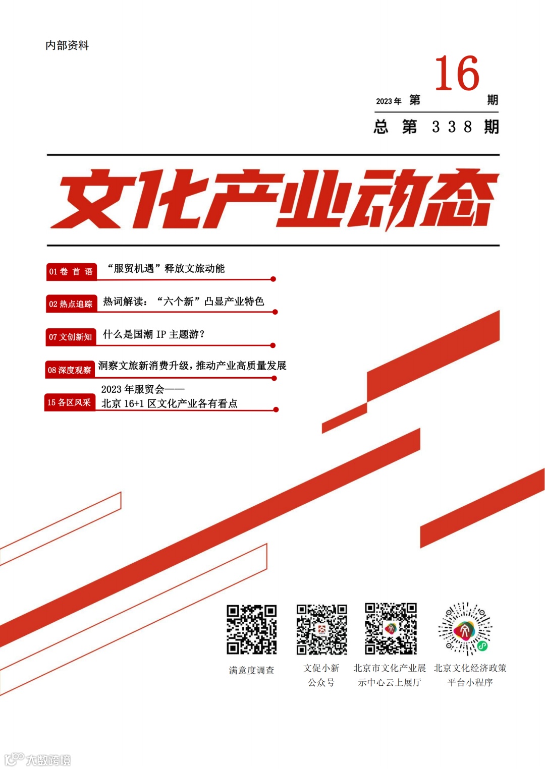 新融合、新场景,呈现首都文化产业发展的新辉煌;新精品、新业态,展示出文化消费的新精彩,本届服贸会共举办了 10 场高峰论坛、102 场专题论坛、18 场边会和 72 场推介洽谈,发布了重要新成果……本期热点追踪聚焦服贸会重点内容,以“六个新”为主,透视文旅等产业新亮点、新红利。深度观察栏目聚焦文旅新消费,从抓实三大市场中坚,把握三大动态增量,发力三大创新路径,分析如何推动文旅产业高质量发展。各区风采栏目纵览服贸会上北京 16+1 区文化产业的多姿多彩。文创新知栏目解读近期热点“国潮 IP主题游”,阐释传统文化在潮流元素赋能下的裂变发展。