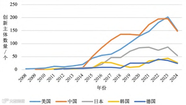 创新主体数量看,整体呈“阶梯式跃升-增速回调”特征,中美平分秋色。2008—2013年为技术萌芽期,年均新增主体不足15家;2014年起随资本涌入与技术成熟度提升进入爆发增长期(2014—2017年CAGR达63.8%),2017年突破300家;2018—2023年增速趋缓但仍维持高位(CAGR 15.8%),2023年达到782家的峰值。2024年创新主体数量首次出现负增长,预示行业进入技术路线收敛、市场出清与头部集中化的关键调整期,从“野蛮生长”转向“高质量发展”阶段(图3)。从各国看,自2014年起,我国创新主体数量快速增长,连续多年领跑全球。美国作为eVTOL领域研究的先行者,其创新主体规模保持稳定高增长态势,凭借技术先发优势持续巩固全球主导地位。日本、韩国和德国的创新主体数量虽维持增长态势,但受限于市场规模和产业水平,与中美两国的总量差距持续扩大,eVTOL产业的发展潜力难以与中美两国相比较(图4)。