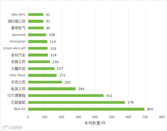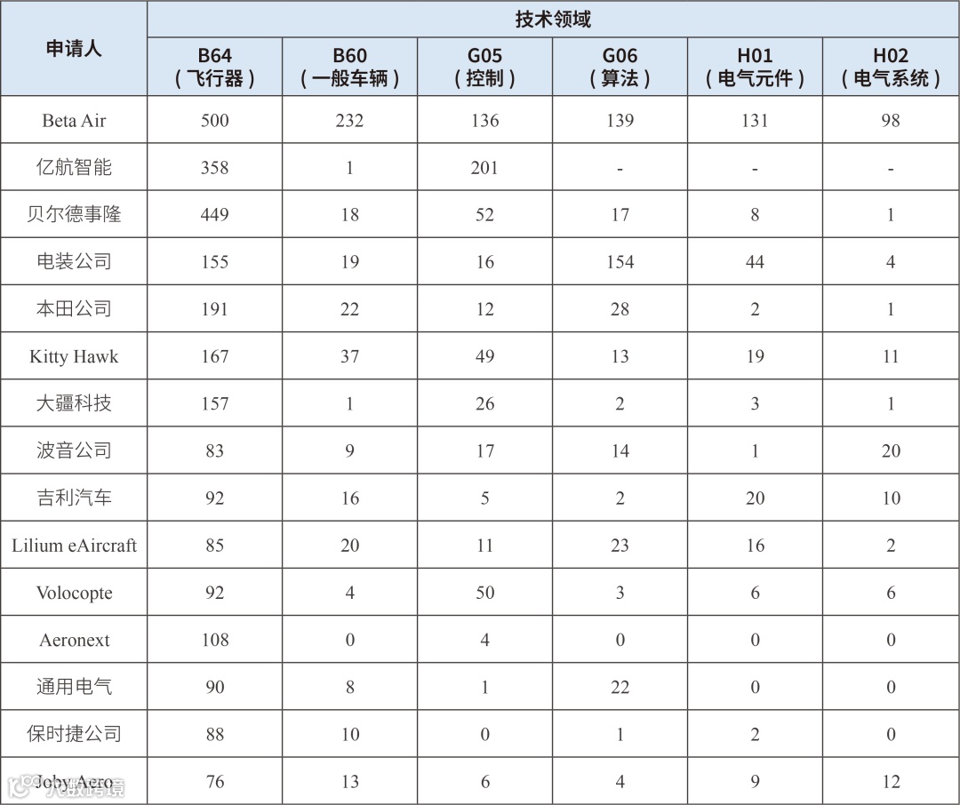 表1 全球重点申请人eVTOL领域专利技术布局(单位:件)