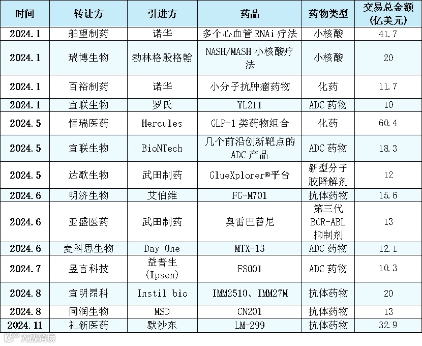 表1 2024年超十亿美元出海的国产创新药榜单