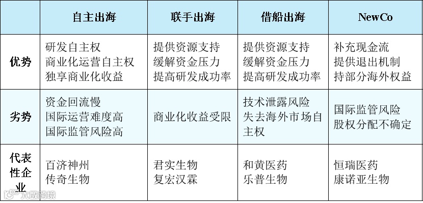 劣势:本土药企失去产品研发和商业化运营自主权,面临海外监管机构质疑、临床试验数据缺乏、双方合作取消等诸多不可控风险导致出海受阻,复创医药、基石药业、诺诚建华、加科思等在出海过程中均被退回。