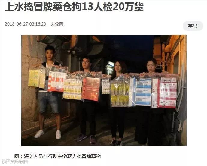 2018年6月,香港警方连同卫生署人员出动,查出20万冒牌药。