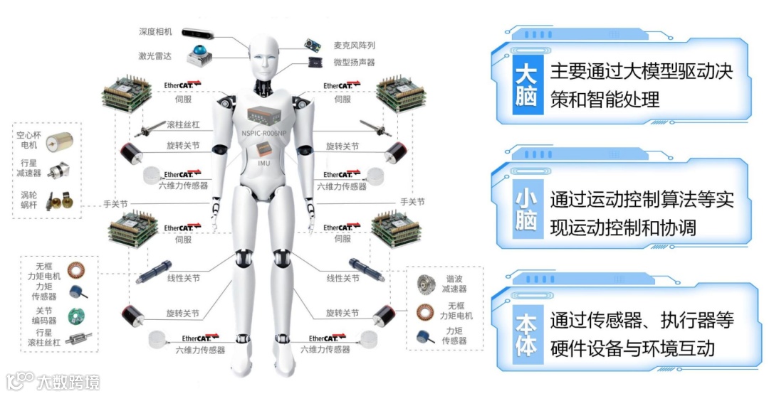 具身智能在架构上可以分为“大脑”“小脑”和“本体”。依托三者协同配合,机器人才能像人类一样去面对各项需求,完成各类任务。其中,“大脑”主要通过大模型驱动决策和智能处理;“小脑”通过运动控制算法等实现运动控制和协调;“本体”通过传感器、执行器、灵巧手等硬件设备实现与环境互动。