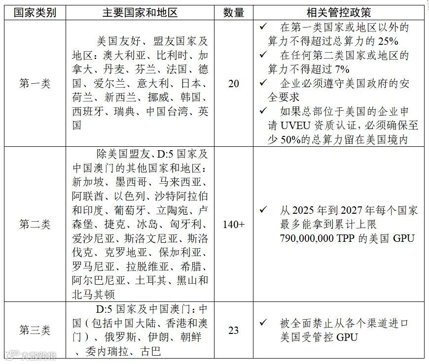 区别于此前只针对中国、俄罗斯等美国认定的“敌对国家”的管制政策,此次美国出台的“人工智能扩散出口管制框架”将全球各国划为三类,并对不同类的国家和实体严格约束全球范围内可以部署的GPU和AI模型权重。美国此举将管制范围从个别国家扩大到全球范围,一方面通过AI算力资源的优先部署保障美国及其盟友国家在AI领域的绝对垄断,另一方面企图通过此框架彻底遏制中国从东南亚、中东等国以转口贸易的方式购置美国GPU的行为。