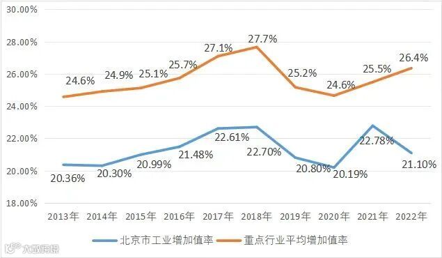 近十年北京市重点行业平均工业增加值率与全市工业增加值率变动趋势基本一致,从2022年情况看,重点行业平均增加值率与全市工业增加值率出现分化走向,短期来看重点行业工业增加值率继续提升体现出北京市产业提质升级初显成效,但产业结构调整提质势能仍需进一步释放。