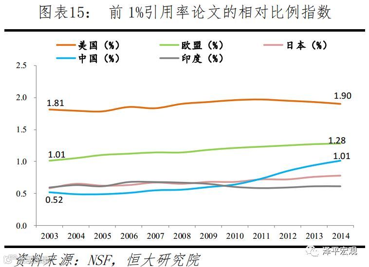 从科学与工程(S&E)领域发表的论文数量来看,2016年排名靠前的国家或地区分别为欧盟(61.4万)、中国(42.6万)、美国(40.9万)、印度(11万)、日本(9.7万),中国首次在数量上超过美国。当然,论文的质量比数量更加重要。2016年科学与工程领域发表的引用率位于前1%的高质量论文中,美国相对比例指数为1.9、欧盟为1.28、中国为1.01,中国近几年高引用率论文的比例有所提升,但相对美国、欧盟来说差距仍然不小。(注:相对比例指数=某国前1%引用率论文数量/论文总数)