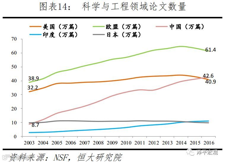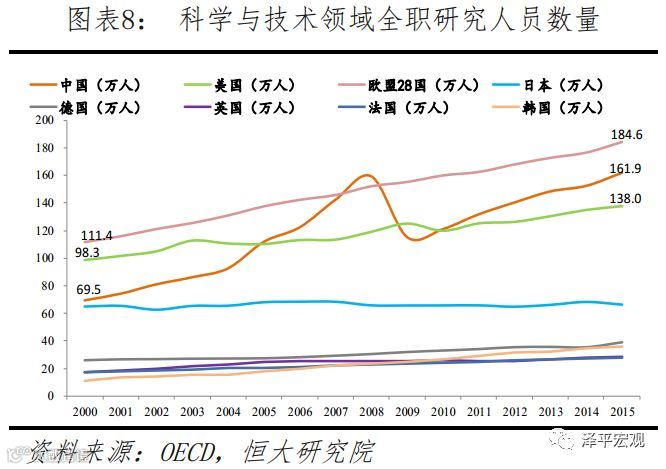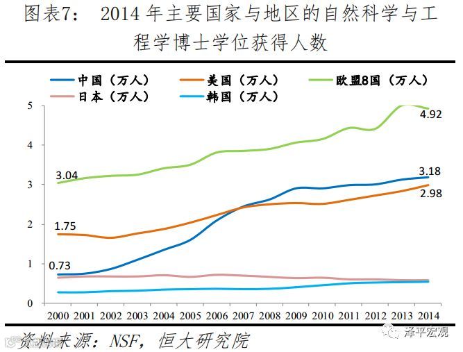 除了研发经费的支持,各类科研成果离不开一支强大的工程师与科学家队伍。2014年自然科学与工程学学士学位获得人数排名靠前的国家与地区分别为中国(145万)、欧盟8国(57万)、美国(38万)、日本(12万)、韩国(11万),中国已经成为世界第一;而博士学位获得人数的国家与地区排名为欧盟8国(4.92万)、中国(3.18万)、美国(2.98万)、日本(0.59万)、韩国(0.55万)。可见在高学历人才供给方面,相对欧美来说中国并没有显著的人数优势,但增长很快,竞争力快速上升。