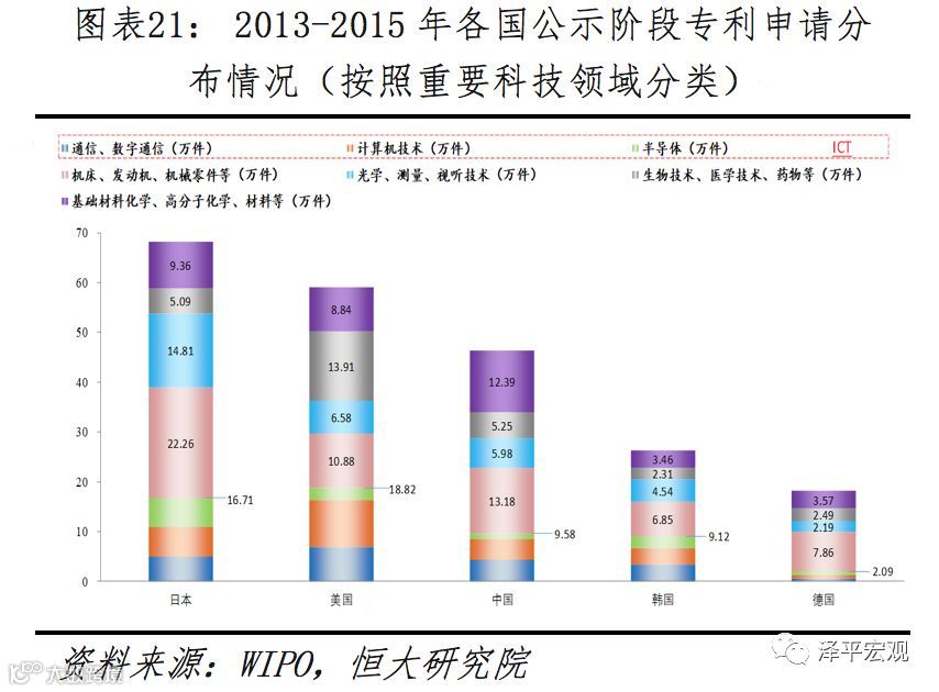 从2013-2015年主要国家已公示专利申请(published patent applications)的行业分布情况来看,美国和日本在通信、计算机技术与半导体领域布局了大量专利,其中美国(18.82万)、日本(16.71万)接近中国的两倍(9.58万)。日本在机床、发动机、机械零件、光学以及测量等领域布局的专利数量显著多于美国和中国;美国除了在ICT领域布局了大量专利,在生物技术、医学技术与药物领域更是一枝独秀,公示阶段专利申请数量超过日本与中国之和;相对来说,中国在基础材料化学、精细材料化学、食品化学等领域布局更多。(注:专利申请18个月后进入公示阶段,通过实质审查后才会被授予专利)