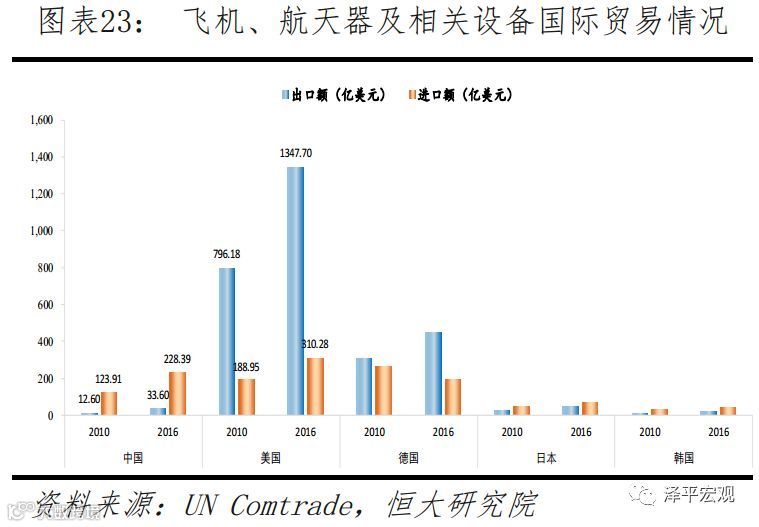 飞机、航天器及相关设备领域,2016年美国顺差超过1000亿美元(出口1347亿美元、进口310亿美元),传统工业强国德国也存在较大顺差(出口444亿美元、进口197亿美元)。中国在此领域存在较大逆差(出口34亿美元、进口228亿美元)。相比于2010年,2016年中国在航空航天领域的逆差金额接近增长一倍,美国的顺差同时大幅增加。航空航天及集成电路已经成为中国迈向科技强国急需提升的技术领域。