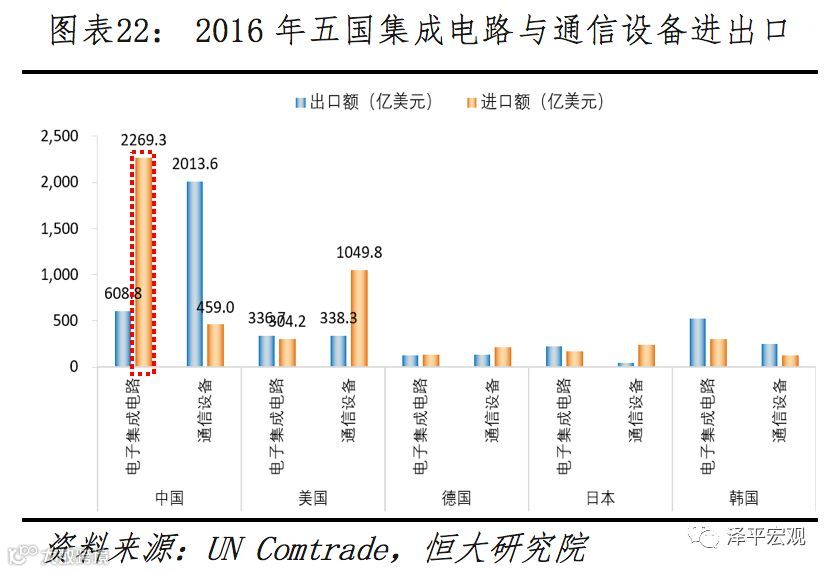 电子集成电路领域,2016年中国是最大的净进口国(出口608.8亿美元、进口2269.3亿美元),目前电子集成电路已经超过原油成为中国进口金额最大的商品。韩国净出口221.9亿美元(出口520.6亿美元、进口298.6亿美元),具有较强的竞争力;美国、日本则保持小额顺差,德国基本持平。值得一提的是商品贸易并不能反映产业竞争力的全貌,对于集成电路这类高科技行业,上游的专利授权等高附加值活动属于服务贸易并不包含在商品进出口数据中,因此结合更具体的价值链构成进行分析是必要的,对于集成电路产业的国际比较我们将在第二章作进一步探讨。