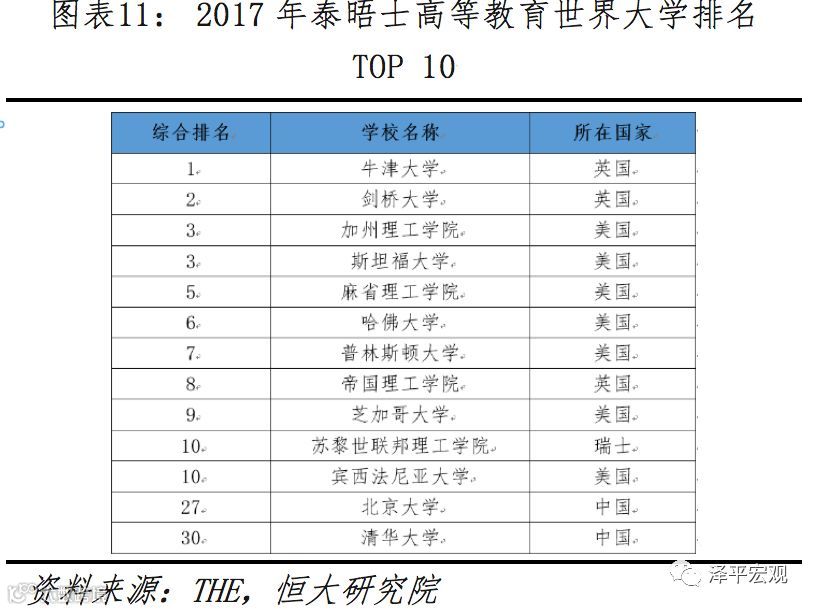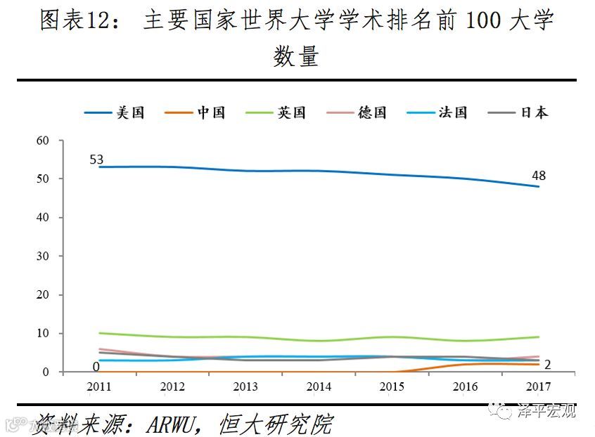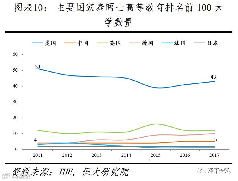 当前国际四大权威的大学排名(QS/US News/THE/ARWU)中,THE(泰晤士高等教育世界大学排名)和ARWU(世界大学学术排名)更偏重教学与研究能力。2017年泰晤士高等教育世界大学排名前100榜单中,美国大学占到43所,其次为英国12所、德国10所,中国共5所上榜。其中排名前10的大学基本都来自美国和英国,中国排名最靠前的清华北大仍在20名开外。2011年以来,美国前100名大学数量有所下降,但仍占到总数的近一半;中国前100名大学数量略有提升,但相比美国差距较大。