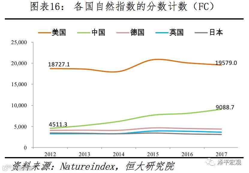 能否发表于顶级刊物是检验论文质量的另一有力证据。为了衡量基础科研产出,《自然》的发行者自然出版集团挑选了82本自然科学领域的顶级期刊(数量不到总体的1%但引用率占总引文数30%),并基于文章合作者的情况计算出了自然指数,考虑文章作者的所属国家与机构情况后得到的自然指数称之为分数计数(FC)。从2017年各国分数计数FC的排名来看,美国(19579)超出第二名中国(9088)两倍多,其次为德国(4363)、英国(3608)、日本(3053)。与S&E论文指标得出的结论类似,中国近年来在基础科研领域的进步较快,但距离美国仍有较大差距。