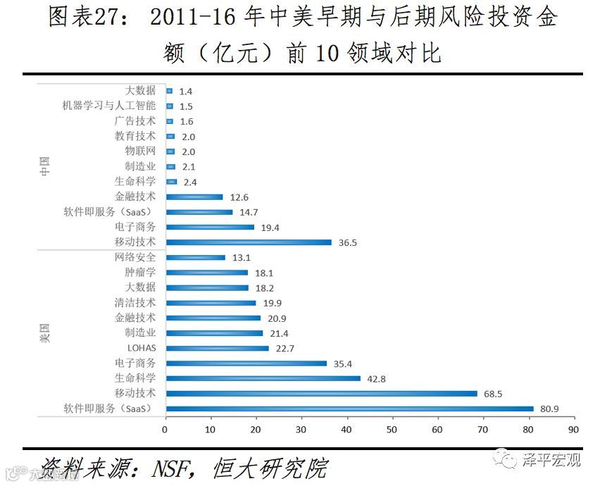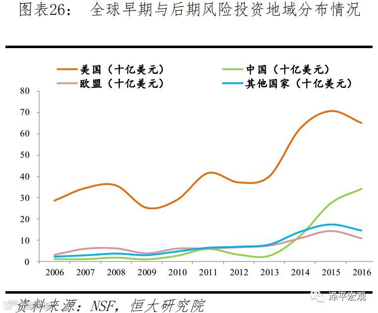 2016全球早期与后期VC规模中,美国达650亿美元仍然占到一半份额,其次为中国(340亿美元)、欧盟(110亿美元)。中国早期与后期VC活动显然比种子期VC活动更加活跃,近几年来规模由2013年30亿美元快速上升至2016年340亿美元,发展速度也远超过其他国家。总体来看,美国和中国已经成为全世界新经济最具活力的国家。