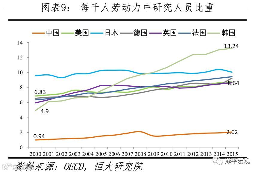 从科学与技术领域全职研究人员数量来看,2015年排名分别为中国(162万)、美国(138万)、日本(66万)、德国(38万)、韩国(36万)。尽管在总量上已经超过美国,中国每千人劳动力中研究人员比重仅2.02,远低于美国、日本、韩国等发达国家。
