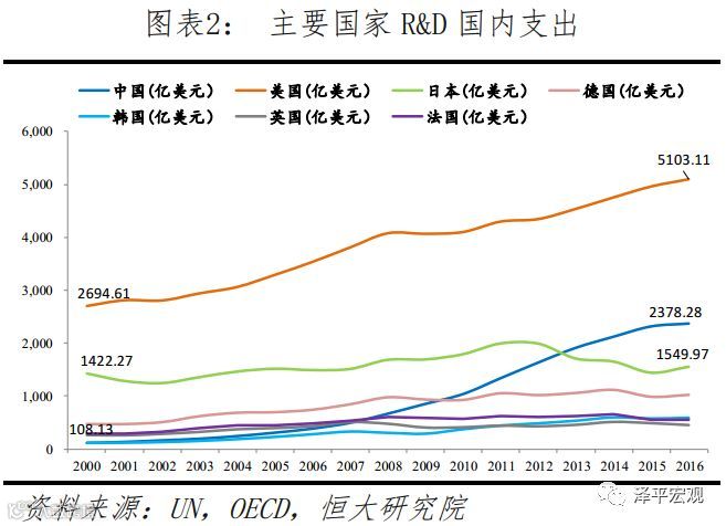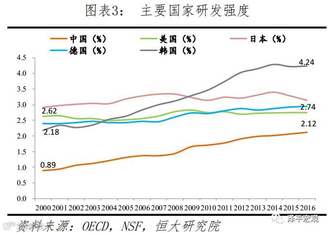 从研发强度(R&D支出/GDP)来看,2016年R&D支出排名靠前国家的研发强度普遍维持在3%左右,其中韩国(4.24%)、日本(3.14%)、德国(2.94%)、美国(2.74%)处于前列。中国2016年研发强度达到2.12%,相较于2000年0.89%的强度水平明显提升,目前已经接近法国(2.25%)并且超过英国(1.69%)等发达国家,但距离美日德韩等国仍有一定差距。