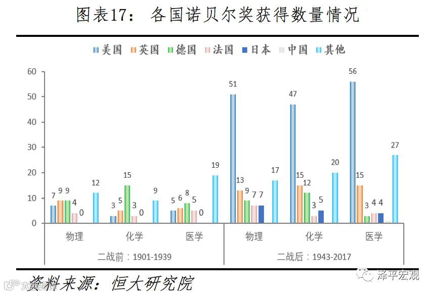 诺贝尔奖是对最顶尖基础科研成果的肯定。从各国诺贝尔奖的获得情况来看,二战前德国、英国、美国处于第一方阵,二战后美国实力大幅提升,不论在物理、化学及医学领域,美国的获奖数量都占到全球总数的半壁江山。而中国目前除了2015年屠呦呦获得诺贝尔生理学或医学奖之外,在物理学与化学领域尚未实现零的突破。