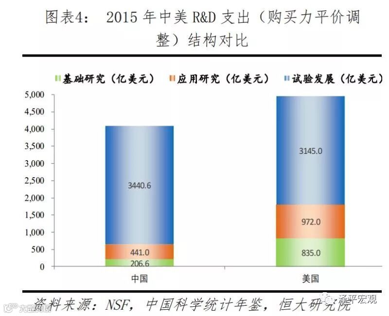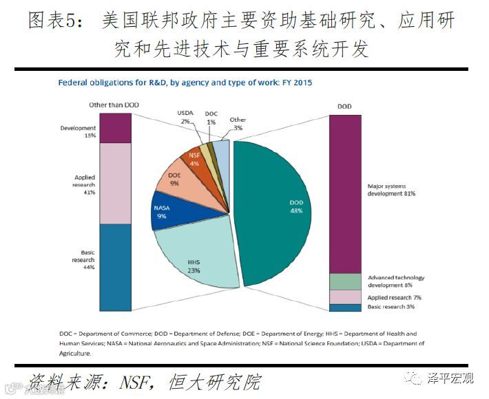从R&D支出的投向结构来看,中国目前的R&D活动主要侧重于试验发展(Experimental Development)阶段(2015年占比达到84%),基础研究(Basic Research)和应用研究(Applied Research)投入比例合计仅16%。而美国则在基础研究和应用研究领域相对投入更多资源,合计占比达到36%。尤其在联邦政府层面,除了国防部外其他部门(包括能源部、NASA等)基本以资助基础研究与应用研究为主,即使国防部资助的试验发展也是以先进技术与重要系统开发为导向,并且孕育了ARPANET(阿帕网,因特网的前身)、GPS(全球卫星定位系统)等重要发明。