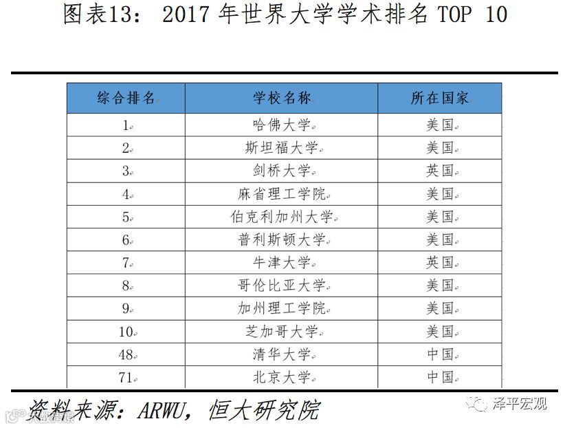 另一份更加注重科研与学术的ARWU榜单中,2017年排名前100大学美国仍然以48所占到近一半,中国仅清华北大两所上榜。榜单排名前10的大学中,哈佛大学、斯坦福大学、麻省理工学院等美国大学占据了8位,而清华北大则排到了40名之外。