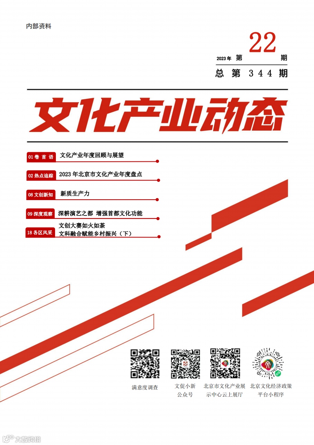 2023 年即将进入尾声,《文化产业动态》今年聚焦数字文化、文化消费、文旅融合三大主题,以新视角持续追踪行业发展政策、成果、经验等动态情况,为读者带来全新解读和分享。这一年产业持续恢复向好,这一年系列支持政策频出,这一年各项发展数据喜人……站在岁末年初的关键节点,本期继续聚焦三大主题,对全年产业发展情况进行总结盘点,既是回顾,也是展望,我们将与大家携手共奋进,以更强信心迎接新一轮发展良机。