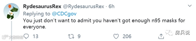 (2)美国疾控中心(美国CDC)的推特账号发布消息称“CDC暂不推荐使用口罩预防新冠病毒”,并建议民众采取“日常预防措施”。都到了这种地步,美国的某些部门真是够可以,就连FBI前一阵都被爆出来在秘密购置口罩等防疫用品,现在美国官方却不让一般的民众戴口罩。要知道戴口罩是防御新冠病毒传播最有效的措施,不知道政府现在是愚蠢,还是故意要推动新冠疫情的扩散。美利坚的人们啊,碰上这样的政府只能自求多福了。