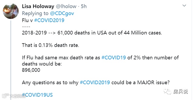 这则推文引来了不少民众的嘲讽。有人贴出数据,表示当前疫情的致死率远高于导致美国6万多人死亡的流感,呼吁大家重视当前疫情的危害。(注:数据需以专业机构发布的信息为准)
