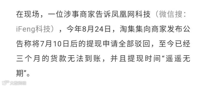 据凤凰网报道,今年7月10日开始,所有在淘集集上提款的商家要求,全部开始被退回: