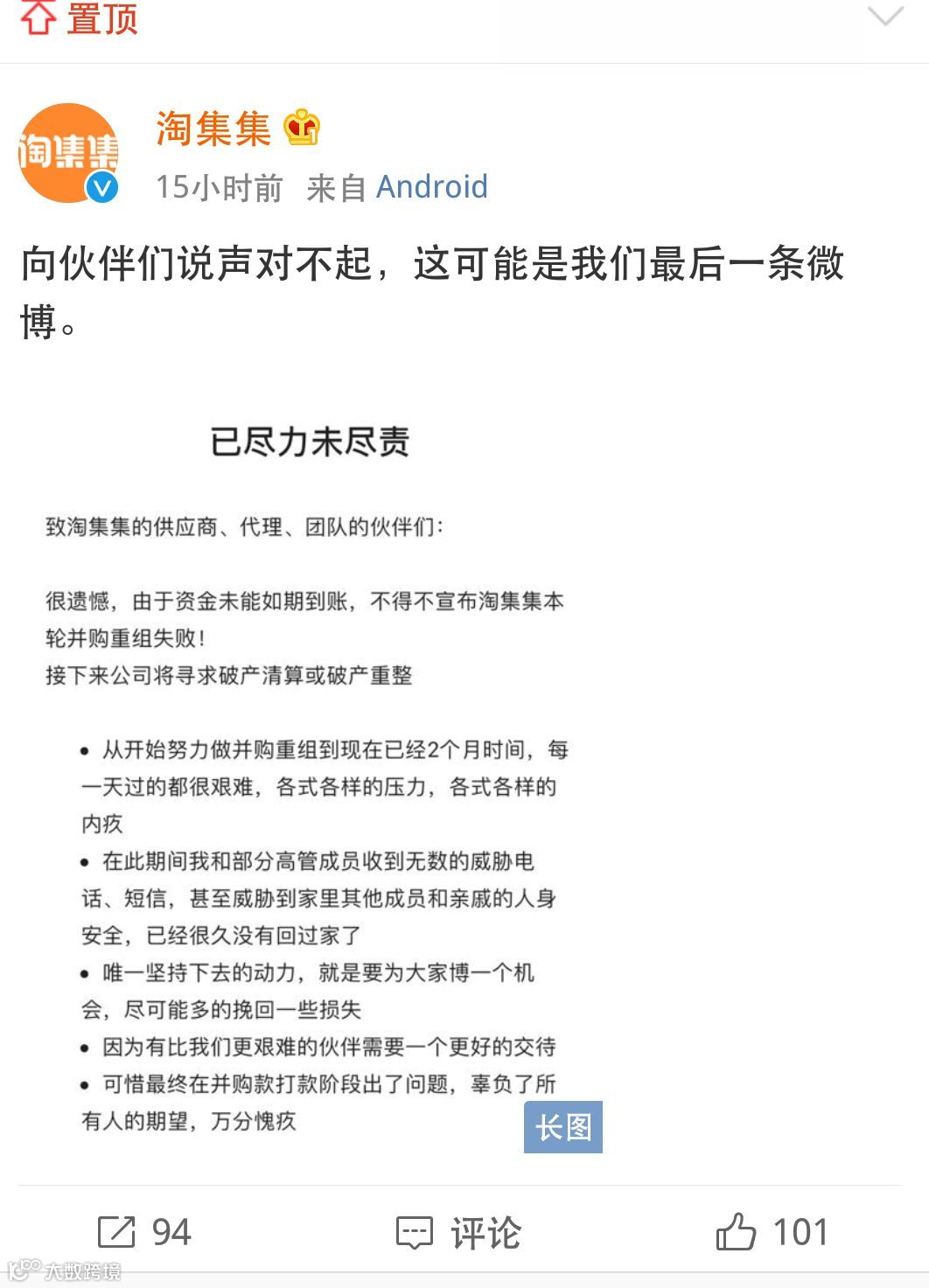 北京时间2019年12月9日凌晨,淘集集官方在微博发布公告表示,由于资金未能如期到账,不得不宣布淘集集本轮并购重组失败,接下来公司将寻求正式破产清算或破产重整。