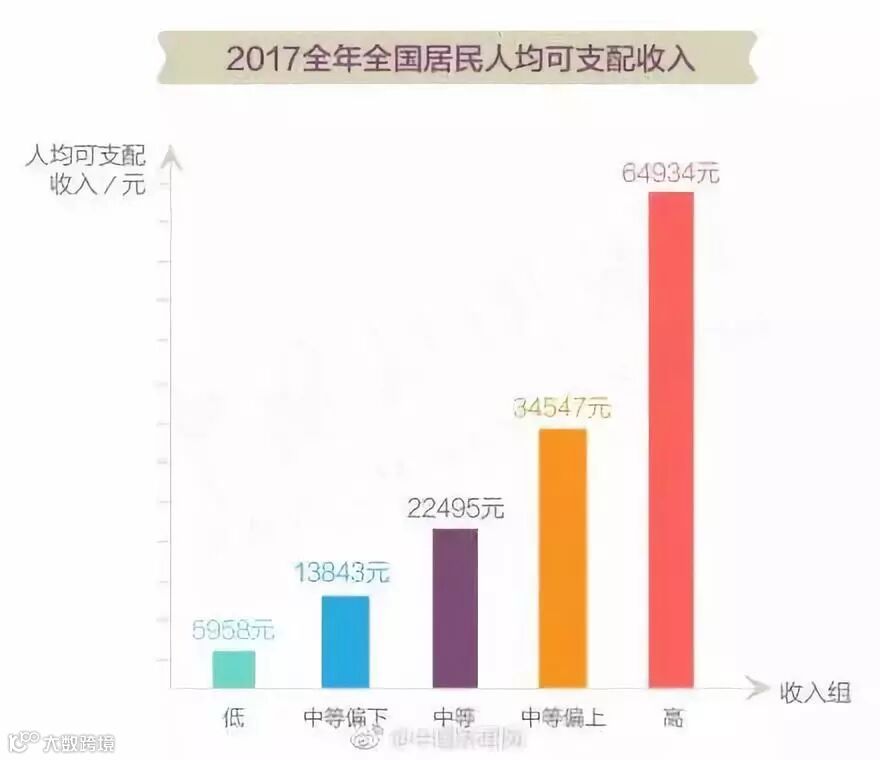 2017年,低收入组人均可支配收入5958元;中等偏下收入组人均可支配收入13843元;中等收入组人均可支配收入22495元;中等偏上收入组人均可支配收入34547元;高收入组人均可支配收入64934元。