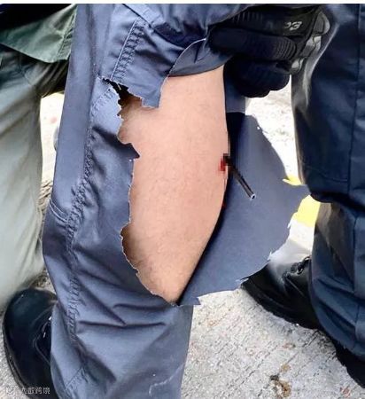 图:弓箭已射入警察腿内,