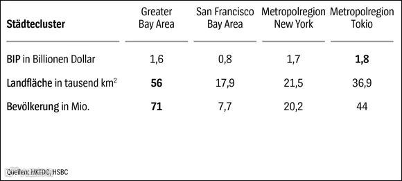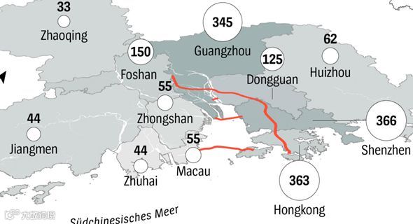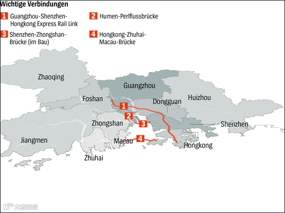 即便如此,目前的珠三角仍无法匹配中国政府发展经济的决心。今年二月份中国共产党在制定珠三角经济规划时指出,必须要向东京、芝加哥和旧金山这些日美大型城市群吸取经验,打造成全世界最先进、最开放的有中国特色的港粤澳大湾区新型大城市群。美丽的珠江就像一条彩带,把各个城市连在一起。
