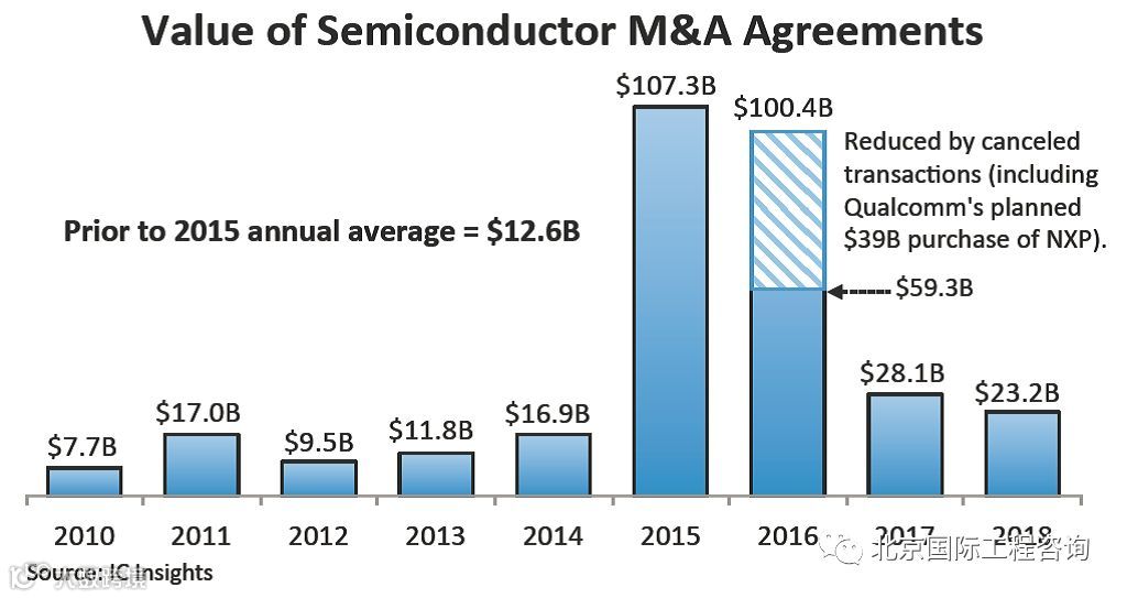 半导体行业并购在2014年前平均每年的交易额维持在126亿美金左右,但在2015年、2016年全球并购市场势头强劲(中国企业开启声势浩大的海外投资和并购热潮),半导体并购也达到规模最高峰。2017年后由于国际间政府审查严苛等一些原因,全球半导体并购从数量到个案金额都迅速下降。但仍高于2014年前的水平,据ICinsights统计,2017、2018年全球半导体产业并购规模(只统计已经交易完成的并购)分别达到281亿美金、232亿美金,仅是高峰期交易规模的1/4-1/3。