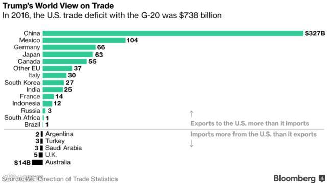 美国2016年的贸易统计,上面为贸易赤字国