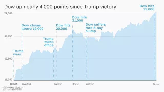 目前,道琼斯水平达到特朗普上任以来最高,增加了将近4000点,比去年增长了12%,并由于美国股市的优秀表现,带动了除A股以外所有主要经济体的股票市场。