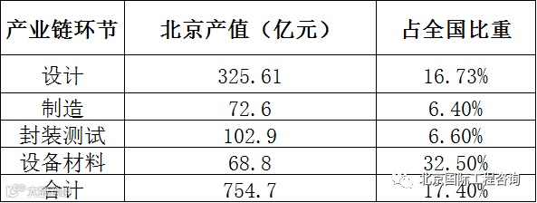 表1:北京集成电路产业链各环节产值规模及占全国比重