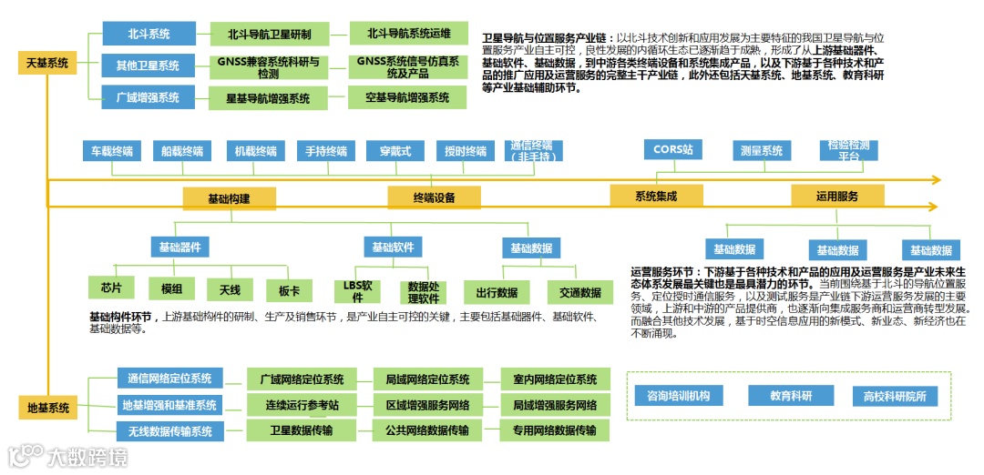 以北斗技术创新和应用发展为主要特征的我国卫星导航与位置服务产业自主可控、良性发展的内循环生态已逐渐趋于成熟,形成了从上游基础器件、基础软件、基础数据,到中游各类终端设备和系统集成产品,以及下游基于各种技术和产品的推广应用及运营服务的完整主干产业链,此外还包括天基系统、地基系统、教育科研等产业基础辅助环节。