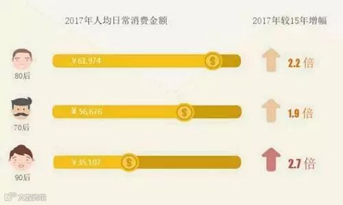 根据中国银联和京东金融发布的《2017年消费升级大数据报告》显示,90后人均消费金额35107元,是2015年的2.7倍,增速比70/80后快得多。