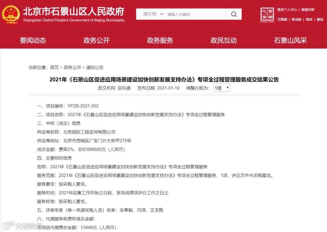北国咨公司2021年《石景山区促进应用场景建设加快创新发展支持办法》专项全过程管理服务