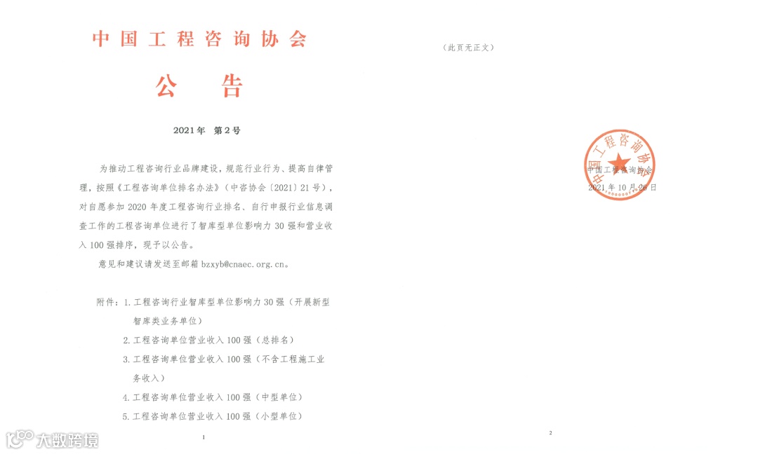 2021年10月,中国工程咨询协会发布了2020年度工程咨询单位行业排名。北京国际工程咨询有限公司(以下简称“北国咨”)凭借出色的研究能力及行业影响力再度脱颖而出,喜获2020年度“工程咨询行业智库型单位影响力30强”称号,同时还成功入选2020年“工程咨询单位营业收入100强(中型单位)”企业。