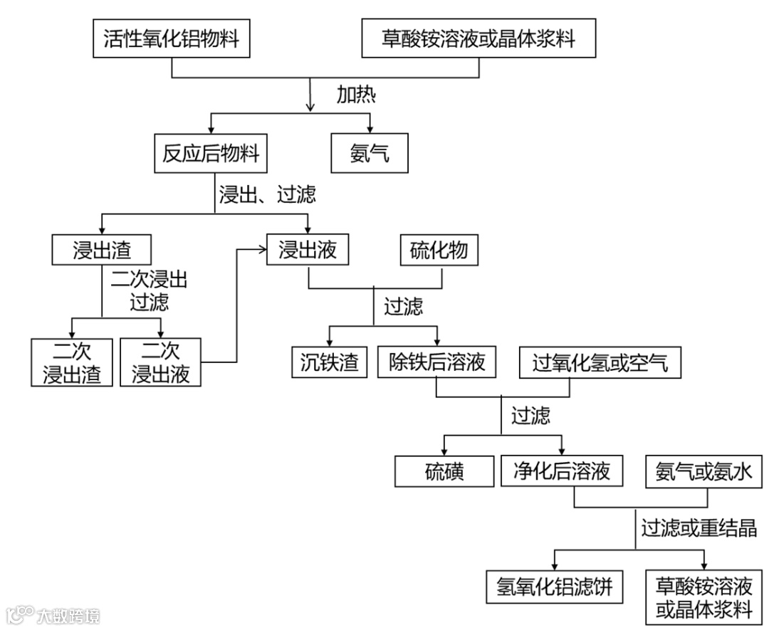 首先,将活性氧化铝物料与草酸铵混合,在水反应体系中加热反应生成氨气、浸出活性氧化铝物料中的铝,得到反应后物料,将反应后物料过滤得到浸出渣和浸出液;