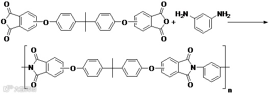 以上述制备的双酚A二酐单体和间苯二胺为原料,通过两步法制备Ultem型PEI基体树脂粉料,质量收率95%,生产成本预计约8~10万/吨,反应方程式如下: