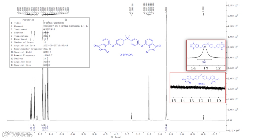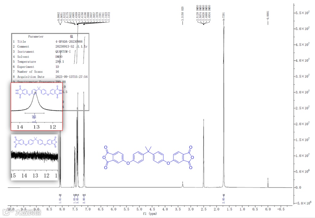 由新技术制备的双酚A二酐单体,经分析检测和聚合反应确认,全部满足于制备PEI基础树脂所需的质量和经济指标要求。